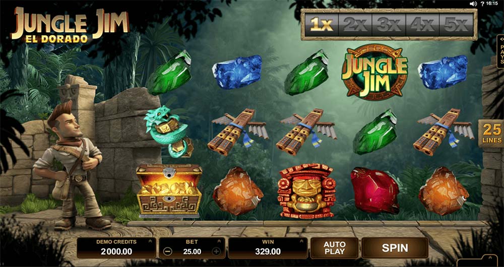 Ci troviamo di fronte ad una slot machine di buona qualità semplice ma molto completa, in perfetto stile Microgaming. La parte estetica e sonora di Jungle Jim El Dorado è ben realizzata, così come le animazioni che fanno scendere le tessere ed indicano le linee di vincita che vengono attivate. In alto a destra nell’area di gioco troviamo poi un moltiplicatore che va da 1x a 5x, con i vari steps che si vanno a riempire ed attivare durante le vincite.
