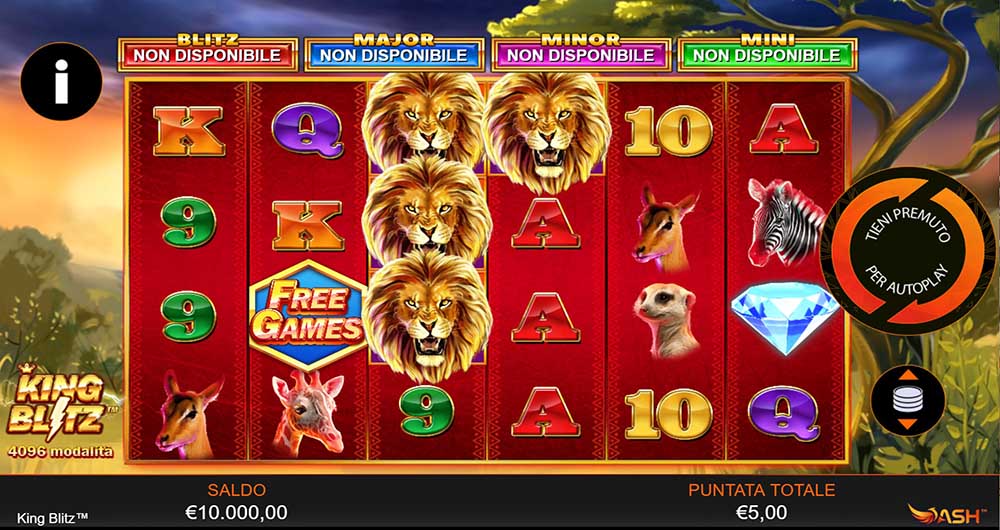 Quando si pensa alla savana, il pensiero corre subito all’animale più rappresentativo della stessa, il leone, vero e proprio re di questo incontaminato e affascinante ambiente. Vero e proprio re di questa zona, il leone viene magnificato anche da Playtech, che in King Blitz lo va a porre al centro della scena. Scopriamo quindi pericoli e meraviglie di questo ambiente facendo girare i rulli di questa macchinetta.